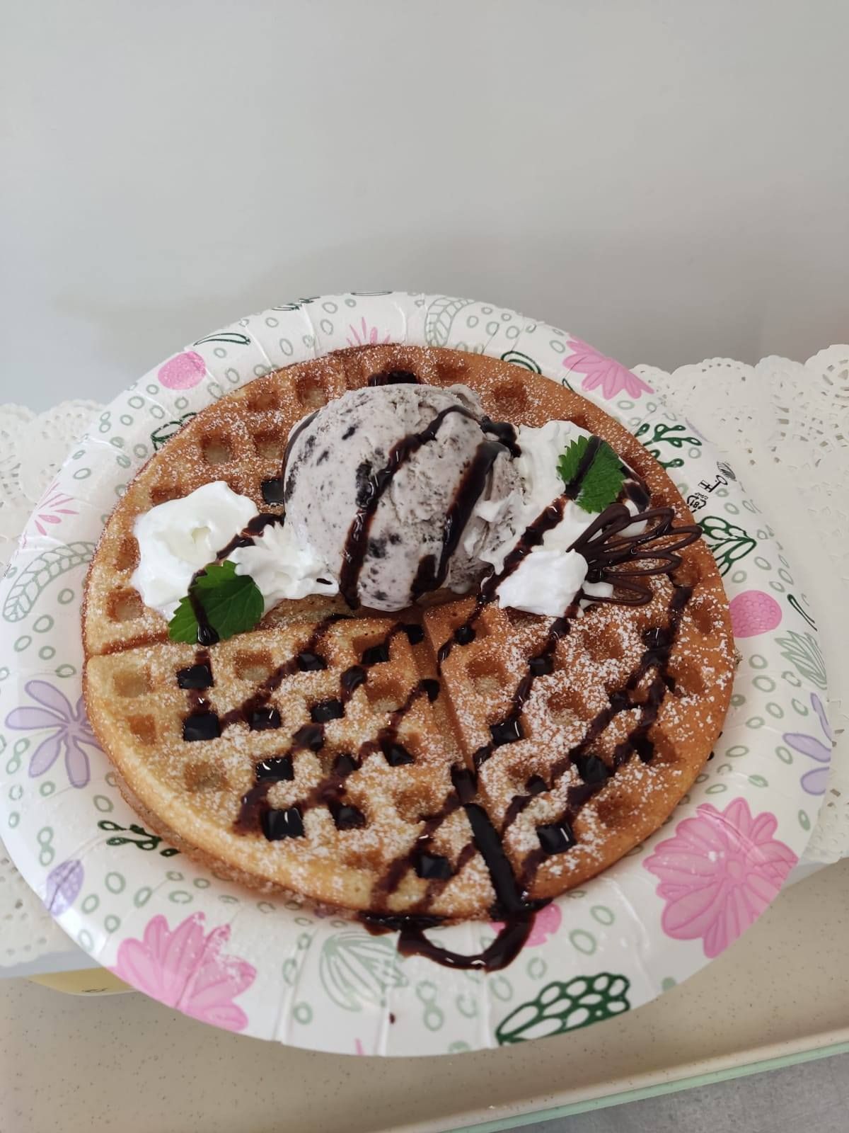 Kahvilassa on myynnissä kuumien ja kylmien juomien lisäksi makeita ja suolaisia leivonnaisia, irtojäätelöä sekä meillä paistetut vohvelit, joita saa myös gluteenittomana.